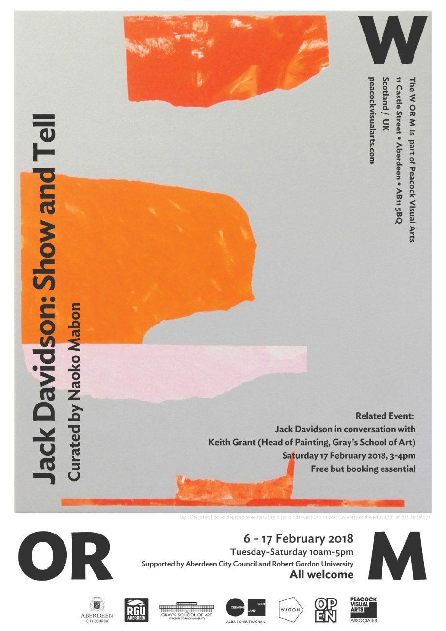 To coincide with his show at The W OR M, Davidson will give a lecture and conduct studio-visits/tutorial sessions with young artists at Gray’s School of Art, Robert Gordon University.